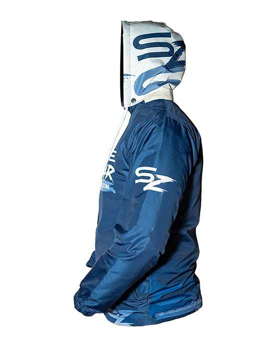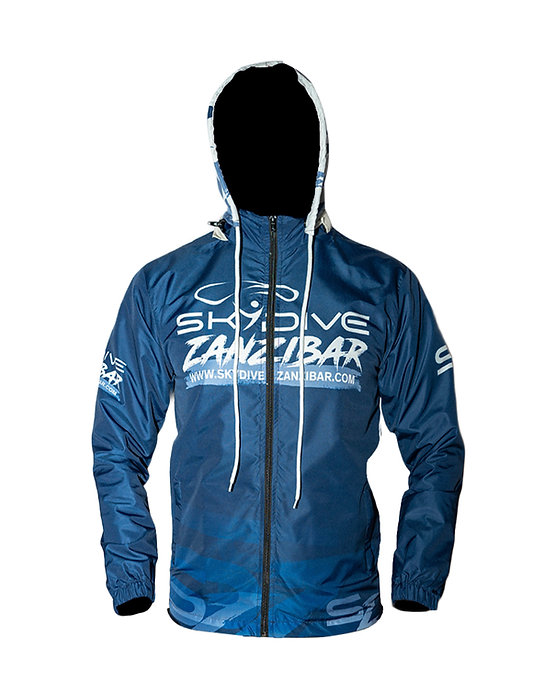 Popular hooded blue rain jacket with Skydive Zanzibar motif